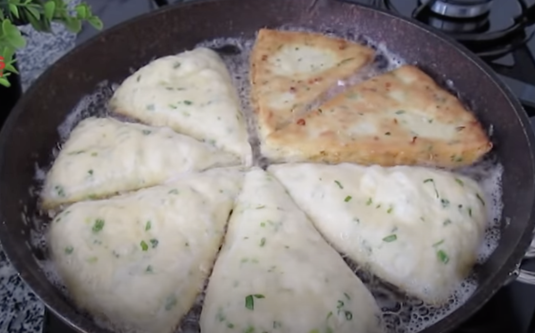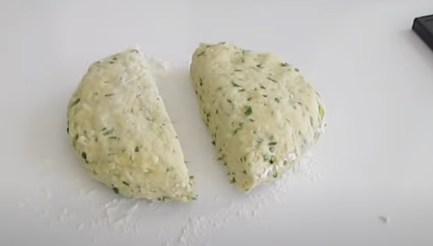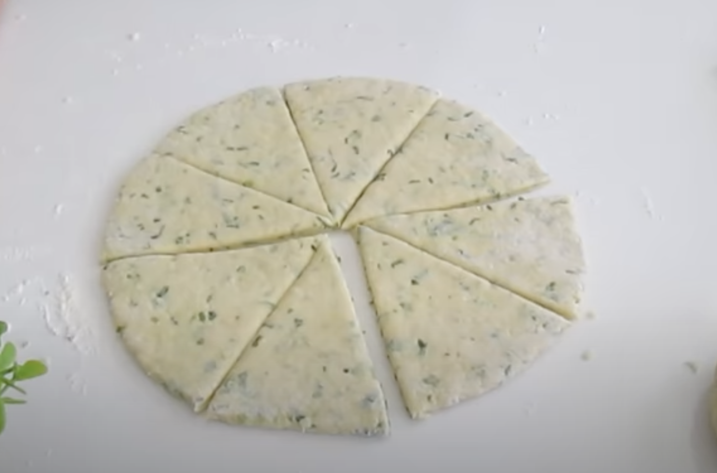 Rozwałkuj każdą z części, podsypując pod spód mąką, do uzyskania kształtu koła. Pokrój całość w trójkąty (podobnie jak kawałki pizzy).