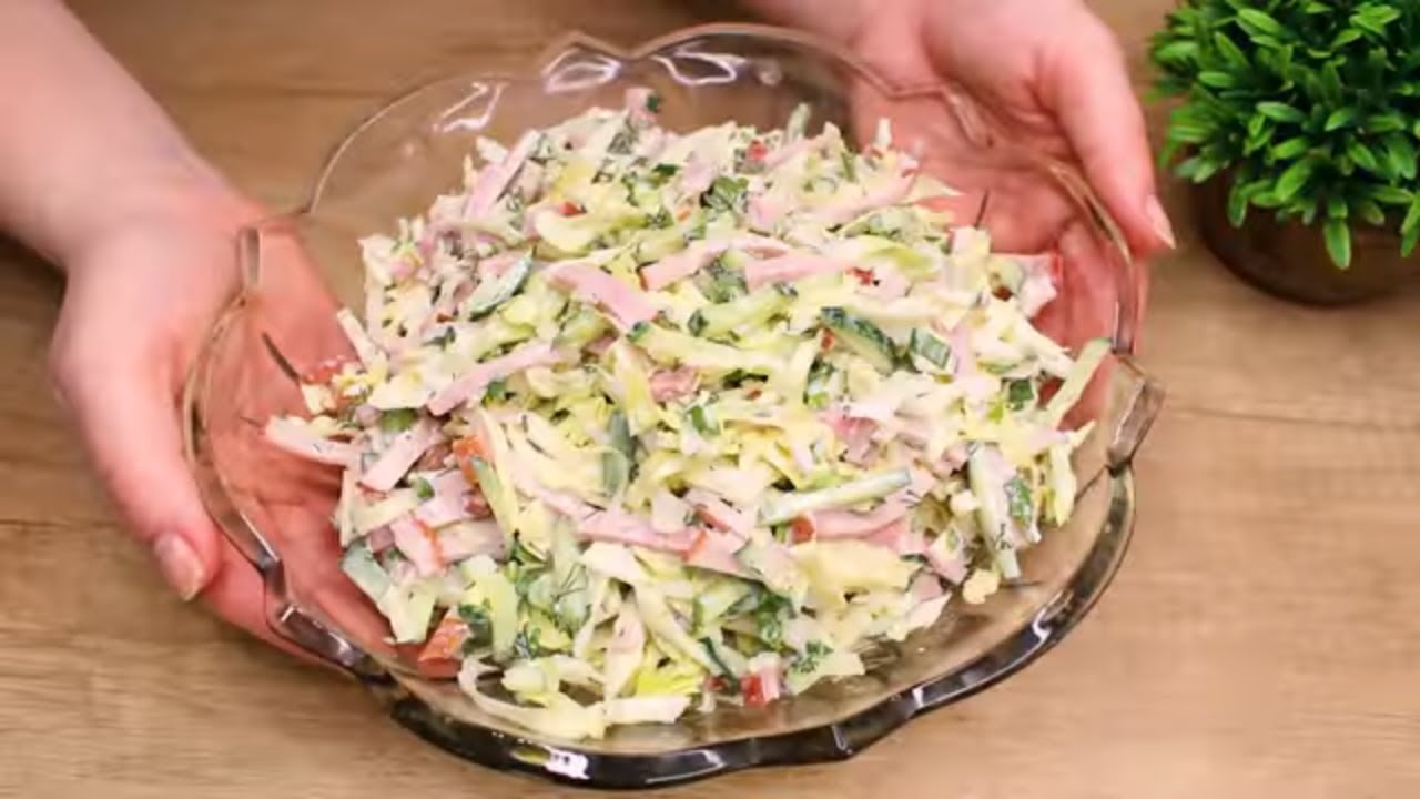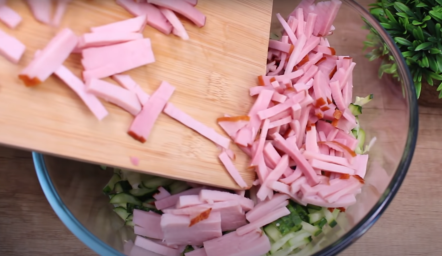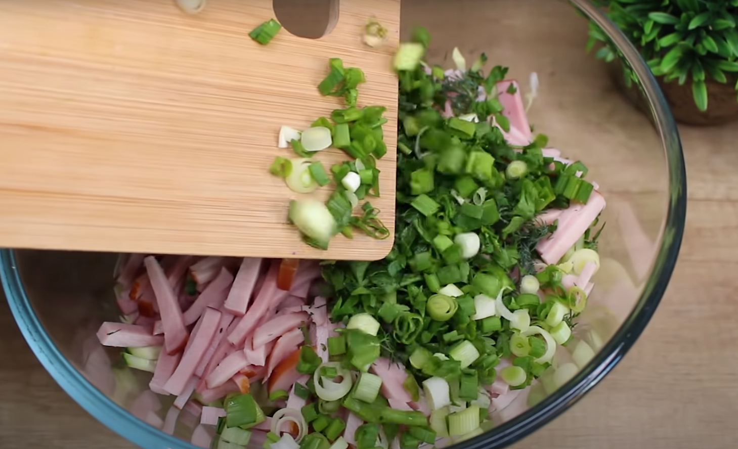 Pokrój składniki: białą kapustę, ogórki kiszone, szynkę i cebulę. Wymieszaj z posiekanym koperkiem i pietruszką.