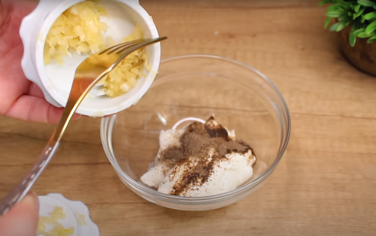 Najpierw przygotuj czosnkowy dressing. Czosnek przeciśnij przez praskę, wymieszaj z jogurtem naturalnym i przyprawami.