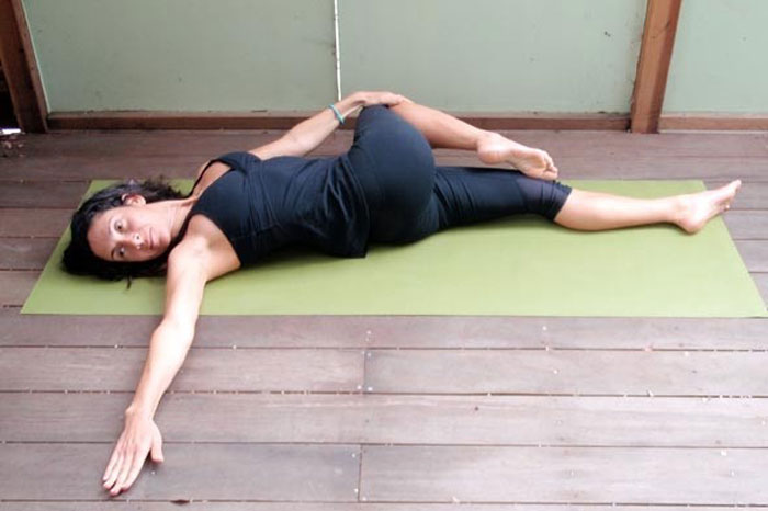 Druga noga powinna zostać na podłodze, wyprostowana. Głowę skieruj w kierunku przeciwnym, do położonej na podłodze zgiętej nogi. Przytrzymaj około pół minuty i zmień stronę.