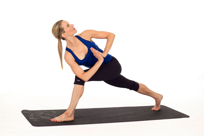 Ustaw się w klasycznym wypadzie, a następnie pochyl się do przodu. Delikatnie skręć biodra w kierunku nogi znajdującej się z przodu. Oprzyj łokieć na zewnętrznej stronie zgiętego kolana i złącz ze sobą dłonie. Przytrzymaj pół minuty, a potem zmień stronę.