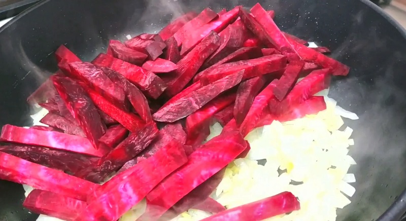 Umyj buraki, a następnie pokrój je na kawałki. Pokrój cebulę na małe kawałki. Dodaj buraki i podsmaż cebulę na oliwie z oliwek. Gotuj na małym ogniu przez 10 minut, od czasu do czasu mieszając.