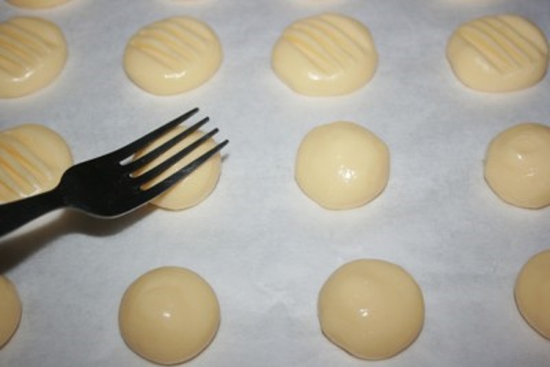 Z tak przygotowanej masy wykrawaj małe porcje i formuj w kulki nie większe od orzecha włoskiego. Umieść je na blasze do pieczenia, uprzednio wyłożonej papierem do pieczenia. Ułóż je w odstępach, by nie skleiły się podczas pieczenia. Widelcem odciśnij prążkowany wzorek na każdym ciastku.