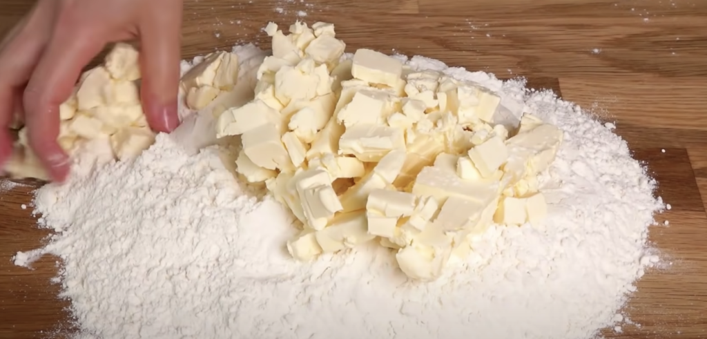 Na blacie z mąki utworzyć kopiec, dodać do mąki posiekane drobno masło i ugniatać.