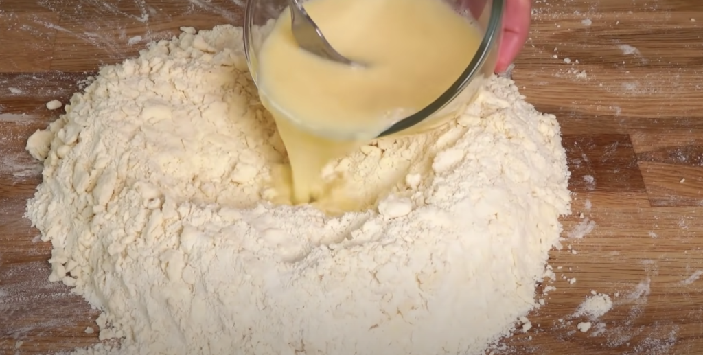 Gdy składniki się połączą należy utworzyć w środku otwór, do którego wlejemy przygotowane wcześniej płynne składniki.