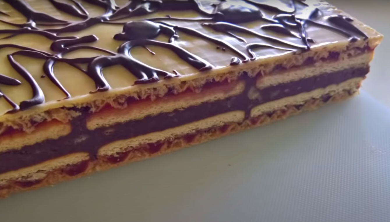 Herbatniki pokryj przygotowaną i wystudzoną masą czekoladową. Posmaruj drugi wafel tortowy pozostałą ilością dżemu. Odwróć wafel dżemem do dołu i umieść na masie czekoladowej. Postaw na cieście deskę do krojenia i połóż coś ciężkiego (mleko, butelki z napojem, mąkę). Umieść ciasto w lodówce na minimum 3 godziny do połączenia się wszystkich składników.