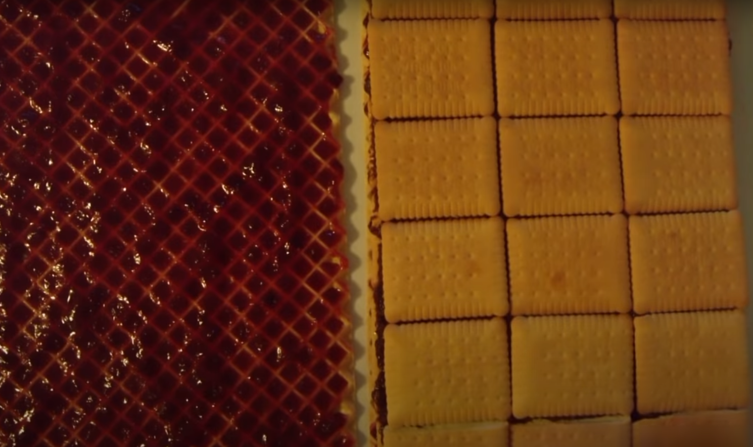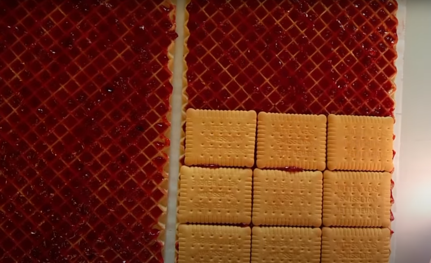 Połóż wafel tortowy i posmaruj go połową dżemu. Pokrusz 150 g herbatników. Pozostałe herbatniki połóż na warstwie dżemu.