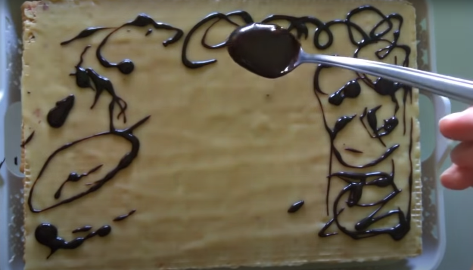 Polewa z białej czekolady i śmietanki – w rondelku umieść 100 ml słodkiej śmietanki, zagotuj. Wrzuć pokruszoną jedną tabliczkę białej czekolady. Odczekaj 2 minuty do rozpuszczenia się czekolady. Udekoruj ciasto. Bita śmietana. Wzorki z gorzkiej czekolady dla przełamania smaku