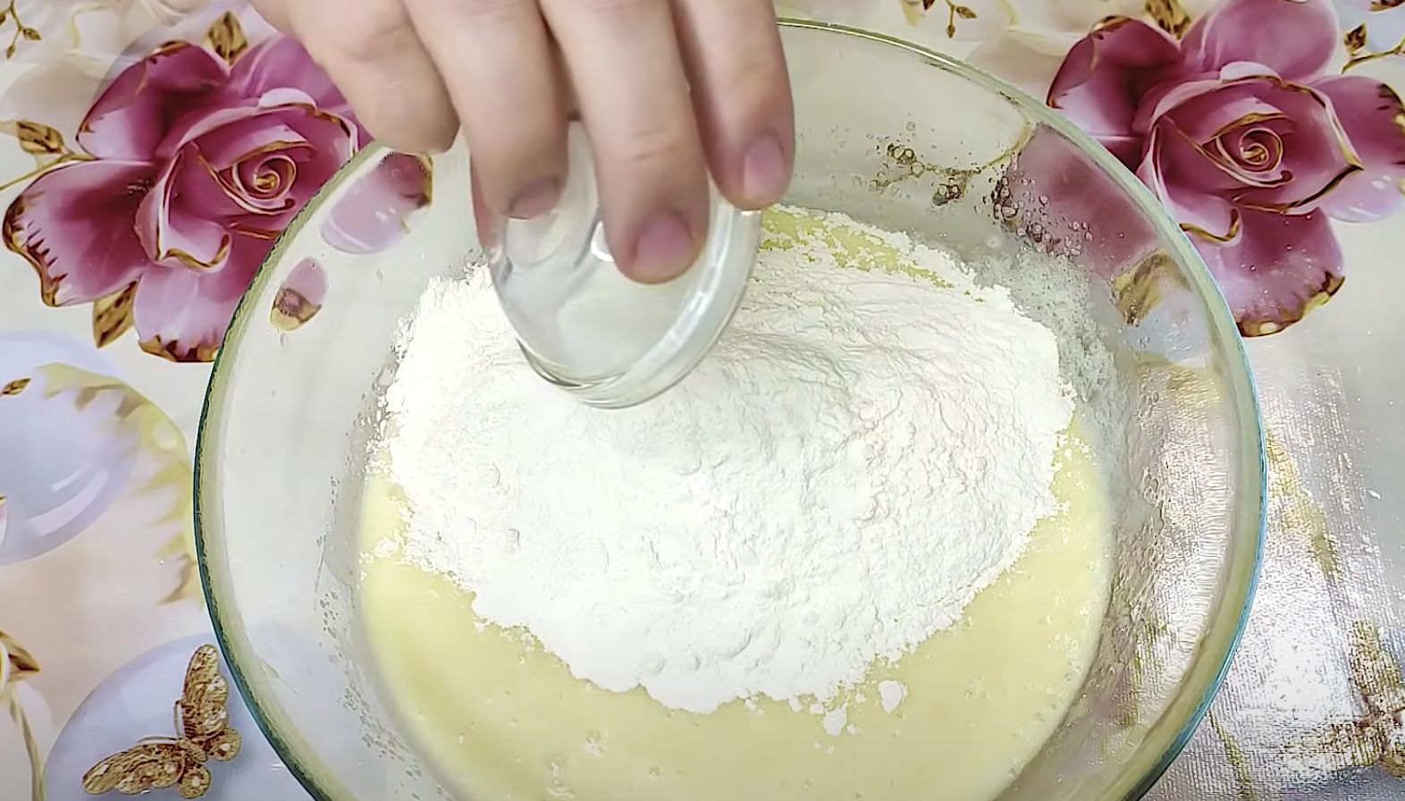 Masło rozpuszczamy i odstawiamy do przestudzenia. Do miski wbijamy jajka. Dodajemy cukier i wszystko energicznie mieszamy ręczną trzepaczką. Następnie dodajemy masło i jogurt. Mieszamy składniki. Powoli dodajemy mąkę wymieszaną z proszkiem do pieczenia. Mieszamy do uzyskania jednolitej, gęstej masy.