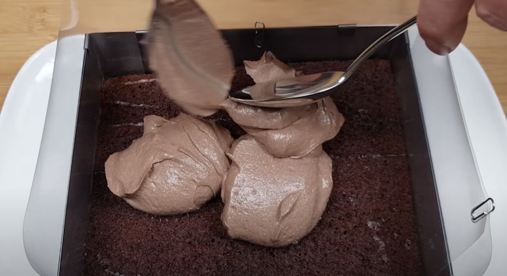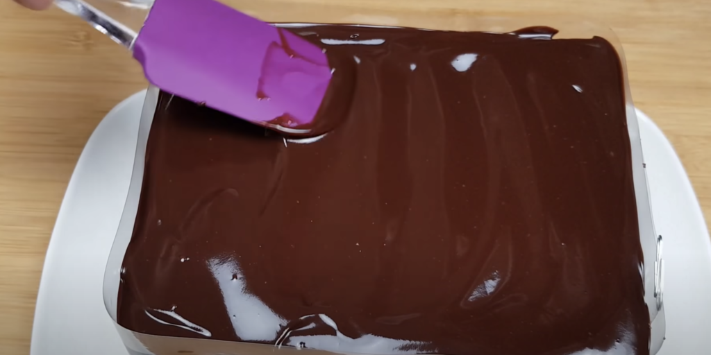 Następnie nałożyć drugą cześć ciasta, lekko docisnąć i ponownie rozprowadzić 1/3 kremu. Kontynuuj, aż wykorzystasz składniki. Po zrobieniu tego włóż ciasto do lodówki, a w tym czasie przygotujesz polewę. Wymieszaj masło z mlekiem i doprowadź do wrzenia. Dodaj połamaną tabliczkę do gorącej mieszanki i mieszaj aż czekolada się rozpuści.