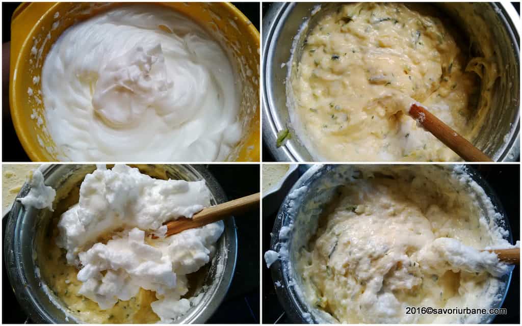 Jajka ubij ze szczyptą soli na bardzo sztywną pianę i wlej je do pozostałych składników. Mieszaj ostrożnie, aby nie zniszczyć bąbelków powietrza, które pomogą ciastu rosnąć. Dopraw białym pieprzem.