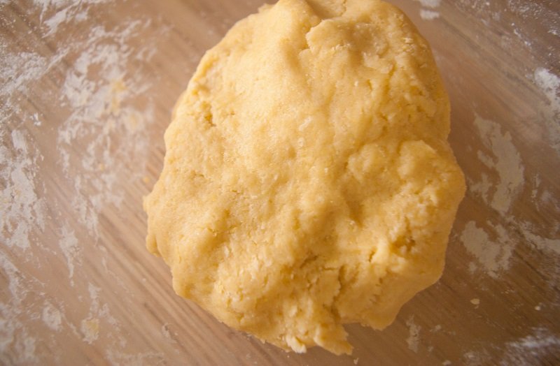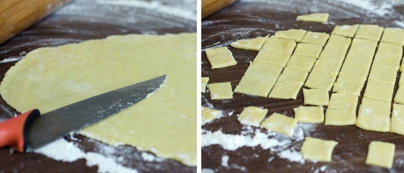 Dokładnie mieszamy, a powstałe ciasto zagniatamy (powinno być bardzo elastyczne) i dzielimy na mniejsze części, żeby lepiej było je wałkować. Wałkujemy na grubość około pół centymetra a następnie kroimy ciasto na niewielkie kwadraty.