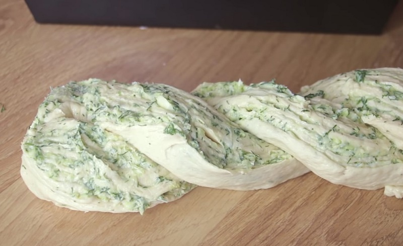 Ciasto zwiń na rolkę, przetnij wzdłuż na 2 części i upleć z nich ” warkocz „, a kolejno zlep końce.