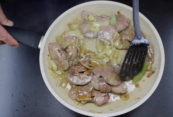 Po upływie maksymalnie dwóch minut odwróć wątróbkę na drugą stronę. Gdy lekko się podsmaży dodaj liście laurowe i wymieszaj całą zawartość patelni.