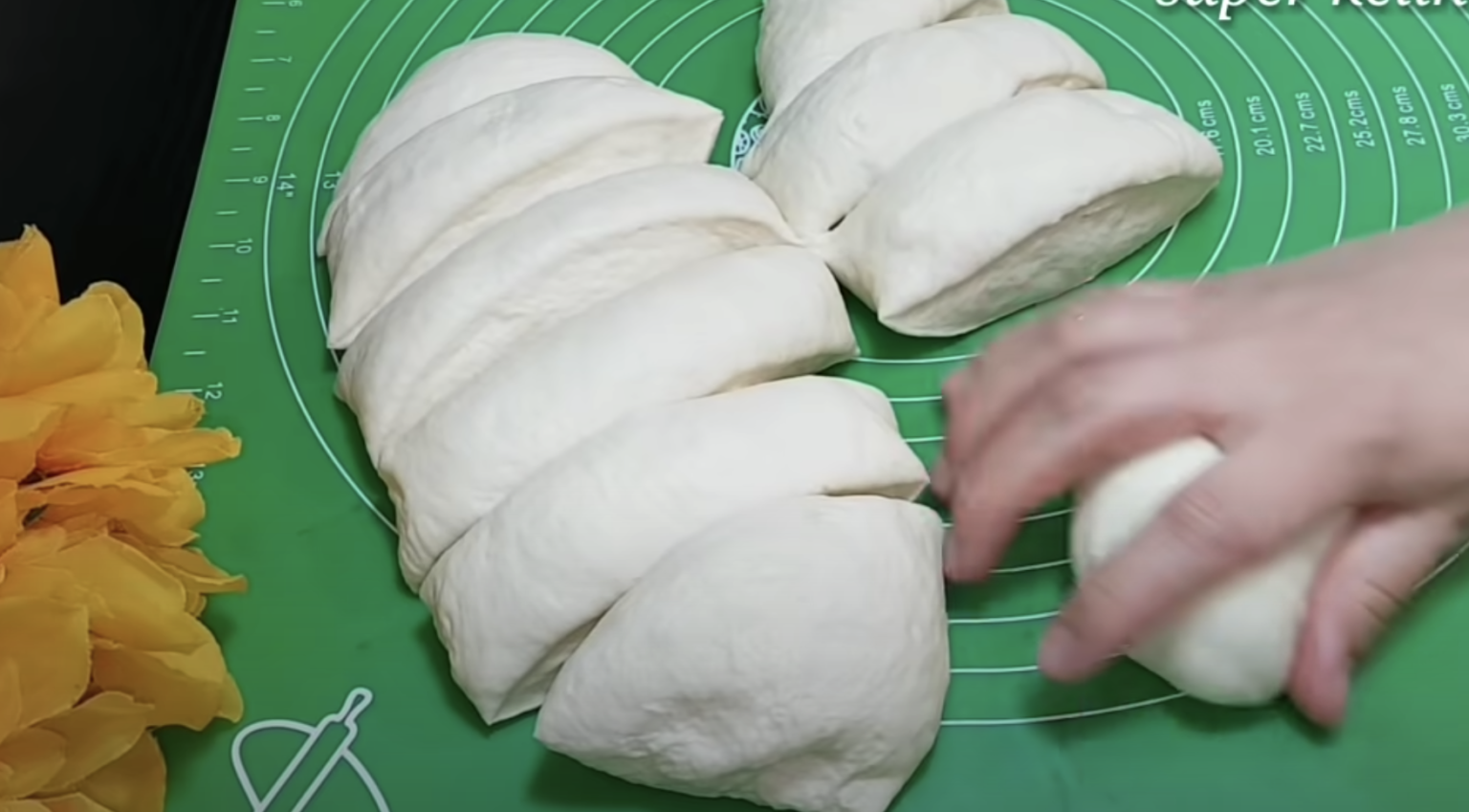 Gdy ciasto wyrośnie, dzielimy dwie części i każdą kroimy na ok. 2 cm paski, z których formujemy bułki.