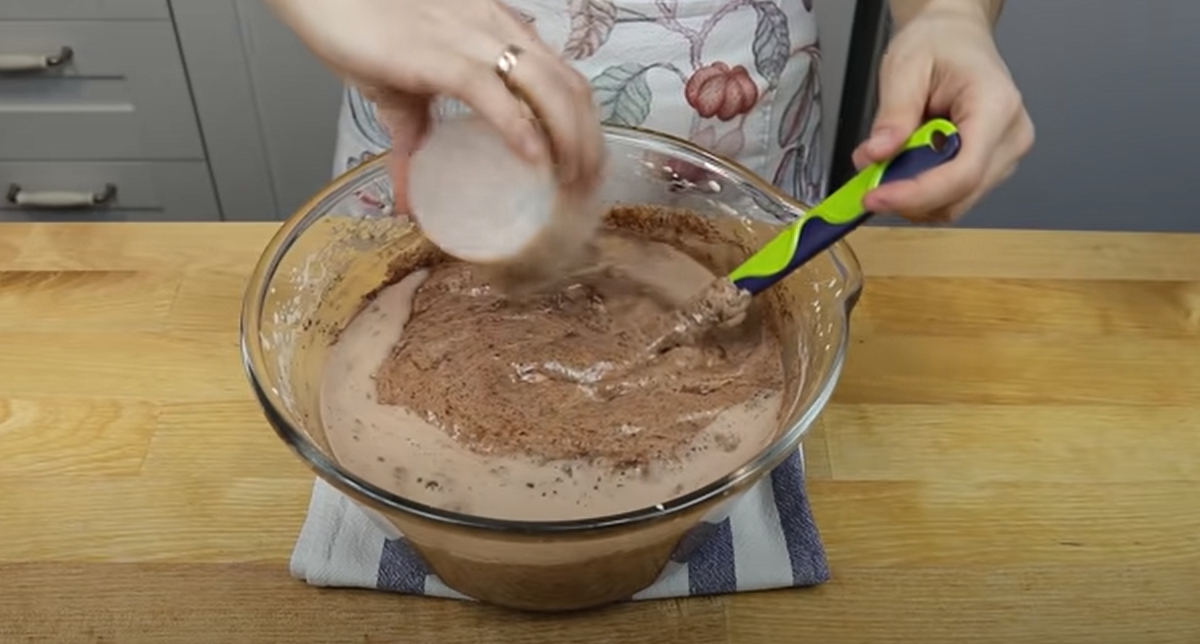 Suche składniki, czyli mąkę, proszek do pieczenia oraz kakao wymieszać w osobnej misce i przesypać do masy jajecznej, po czym dokładnie wymieszać za pomocą łyżki. Wodę trzeba wymieszać z 2 łyżeczkami przygotowanego ciasta i wylać to na brzegi miski, a następnie wymieszać ciasto rozpoczynając od dołu do góry.