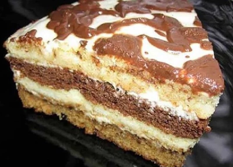 Przygotuj dwa placki. Przygotuj ciasto zgodnie z instrukcją. Podziel je na dwie części i dodaj kakao. Zanim zaczniesz przygotowywać danie, wszystkie składniki muszą mieć temperaturę pokojową. Zmiksuj jajka i cukier ze śmietaną do uzyskania gładkiej masy.