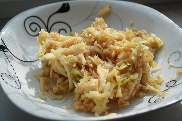 Przygotuj nadzienie. Jabłka obrać i zetrzeć na tarce. Posypać cukrem. Od słodkości jabłek zależy, jak dużo dodasz przyprawy. Oprószonymi mąką dłońmi podzielić ciasto na osiem części. Każdą część podzielić na trzy lub cztery mniejsze kawałki i uformować z nich placki. Górną część można rozciąć, nałożyć nadzienie na dolną, a następnie zwinąć w rulon.