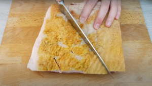 Najpierw zaopiekuj się boczkiem! Skóra na boczku? Możesz ją odkroić lub ponacinać w kratkę. Nagrzej piekarnik do 180 stopni – pamiętaj!