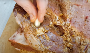 Do małej miski wrzuć zmielony pieprz i czerwoną paprykę, sól oraz suszony czosnek, i wymieszaj wszystko ze sobą. Tak powstałą mieszanką natrzyj boczek. Upewnij się, że mięso jest dokładnie pokryte przyprawami. Pozostały czosnek? Włóż go do mięsa, robiąc nacięcia nożem.