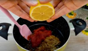 Podczas pieczenia boczku, bierz się za marynatę. Starte na tarce jabłko, koncentrat pomidorowy, sok z cytryny i sos sojowy – wszystko razem wymieszaj. Dodaj przyprawy i zagotuj, aż uzyskasz gładką masę.