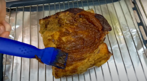 Po dwóch godzinach pieczenia odsłoń mięso, nałóż na nie marynatę i przenieś na grill. Boczek grilluj około 5 minut w 220 stopniach.