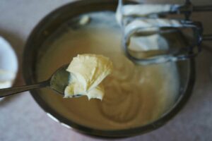 Teraz ubij masło za pomocą trzepaczki i połącz ze schłodzoną śmietaną.