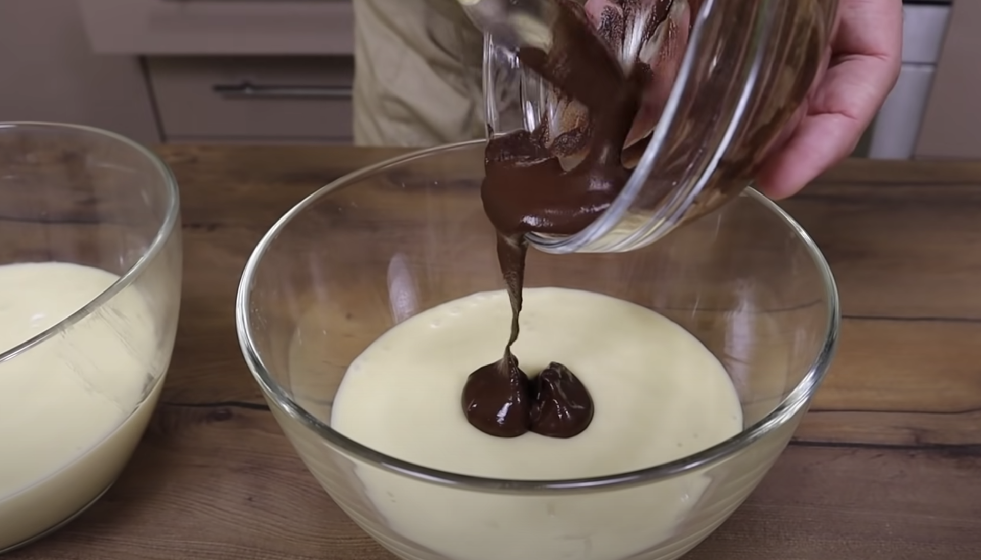 Równocześnie nalewaj obie przygotowane wcześniej masy, aby utworzyły czarno-białą strukturę.