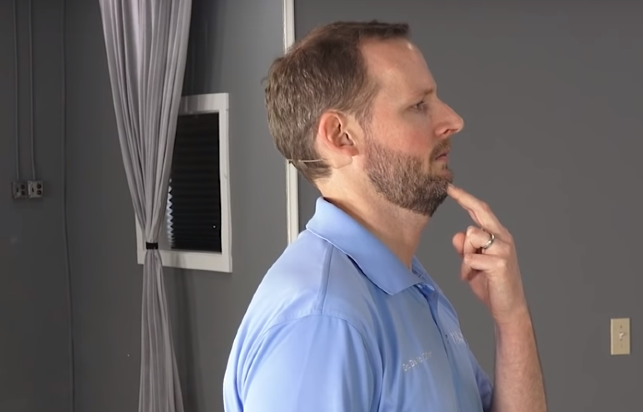 Prostujemy się, przytrzymujemy podbródek środkowym i wskazującym palcem, a następnie delikatnie odchylamy głowę do tyłu – tak, abyśmy nie odczuwali dyskomfortu. Możemy pozostać w tej pozycji przez ok. 10 sekund, a następnie powtórzyć ćwiczenie 5 razy; lub też powtórzyć je 10-15 razy bez pozostawiania głowy z tyłu.