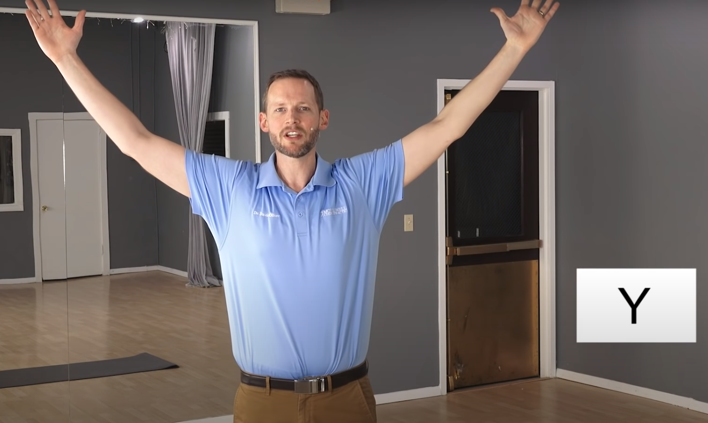 Podnosimy ręce do góry, układając je w kształt litery „Y”. Uważamy, by nie pochylać głowy i nie unosić ramion. Cofamy dłonie i utrzymujemy taką pozycję przez 2 oddechy. Powinniśmy czuć przyjemne rozciąganie klatki piersiowej i ramion.