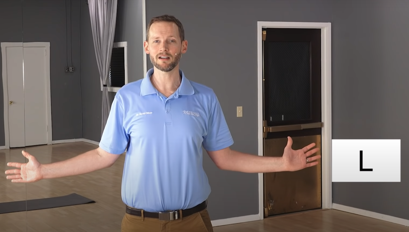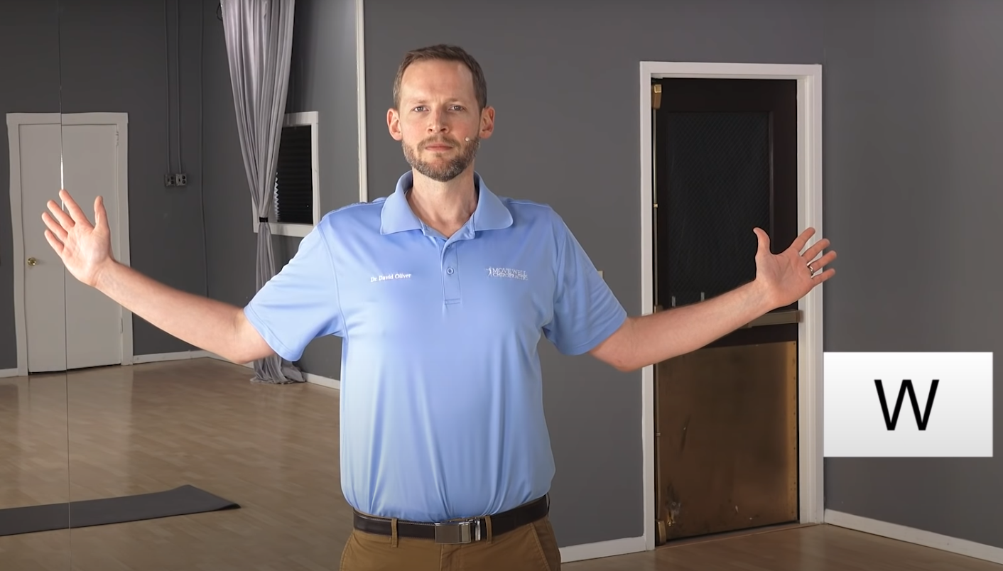 Następnie przyciągamy ręce do pozycji „W” i trzymamy przez kolejne 2 głębokie wdechy. W dalszej kolejności zbliżamy ramiona do ciała, a przedramiona ustawiamy równolegle do podłoża – jest to tzw. pozycja „L”. Oddychamy głęboko.