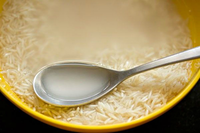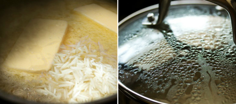 Ponownie zalej ryż zimną wodą i przykryj ścierką lub ręcznikiem papierowym. Odstaw miskę na przynajmniej 2 godziny. Ryż można również moczyć w ciągu nocy lub przez cały dzień. Wylej wodę i ponownie umyj ziarna. Ryż przenieś na patelnię lub włóż do garnka. Zalej go wodą i gotuj przez około 3 minuty na mocnym ogniu.