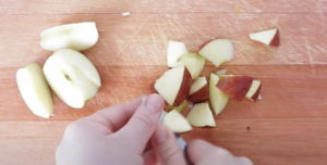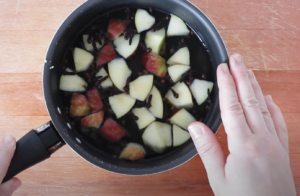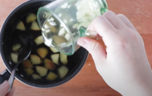 W tym czasie pokrój jabłko, umieść je w garnku, dodaj wodę i goździki.
