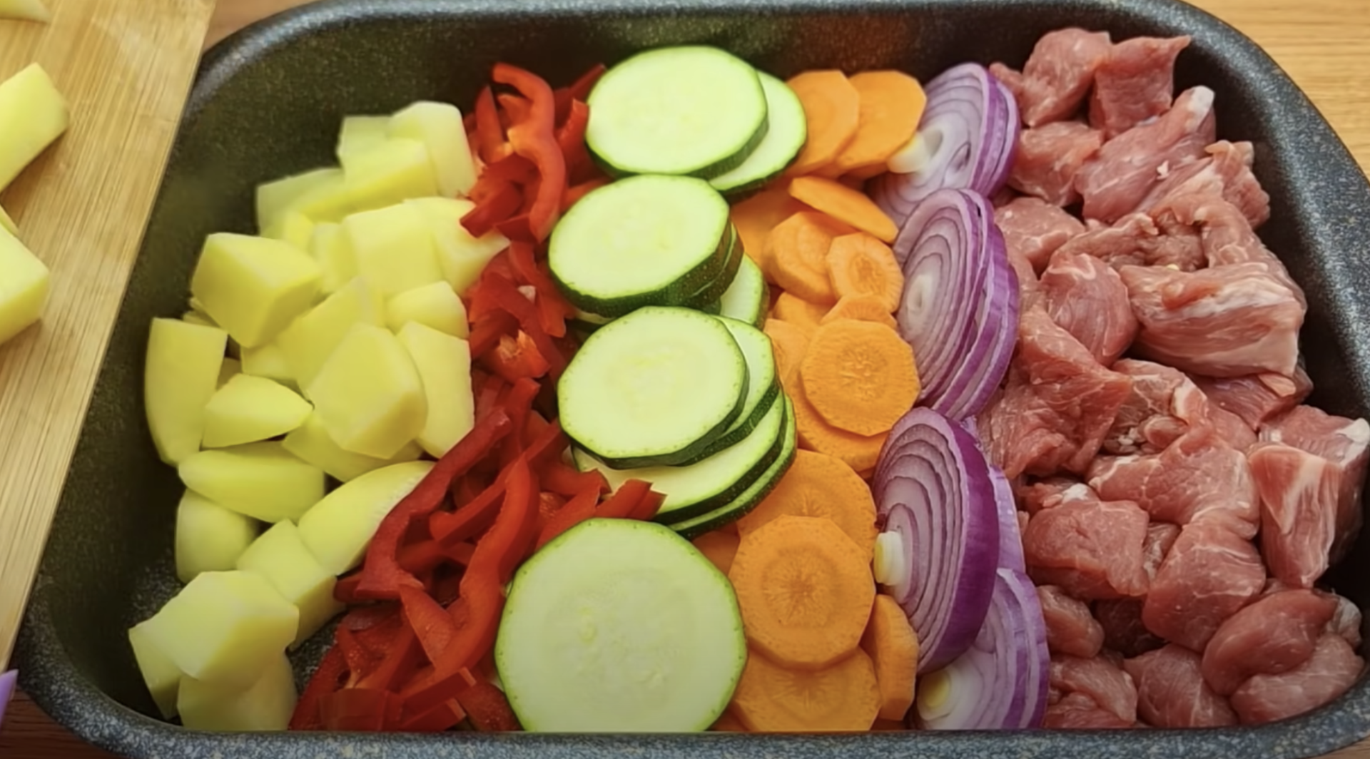 Mięso, ziemniaki i paprykę pokrój w grubszą kostkę, a cebulę, cukinię i marchewkę – w plasterki.