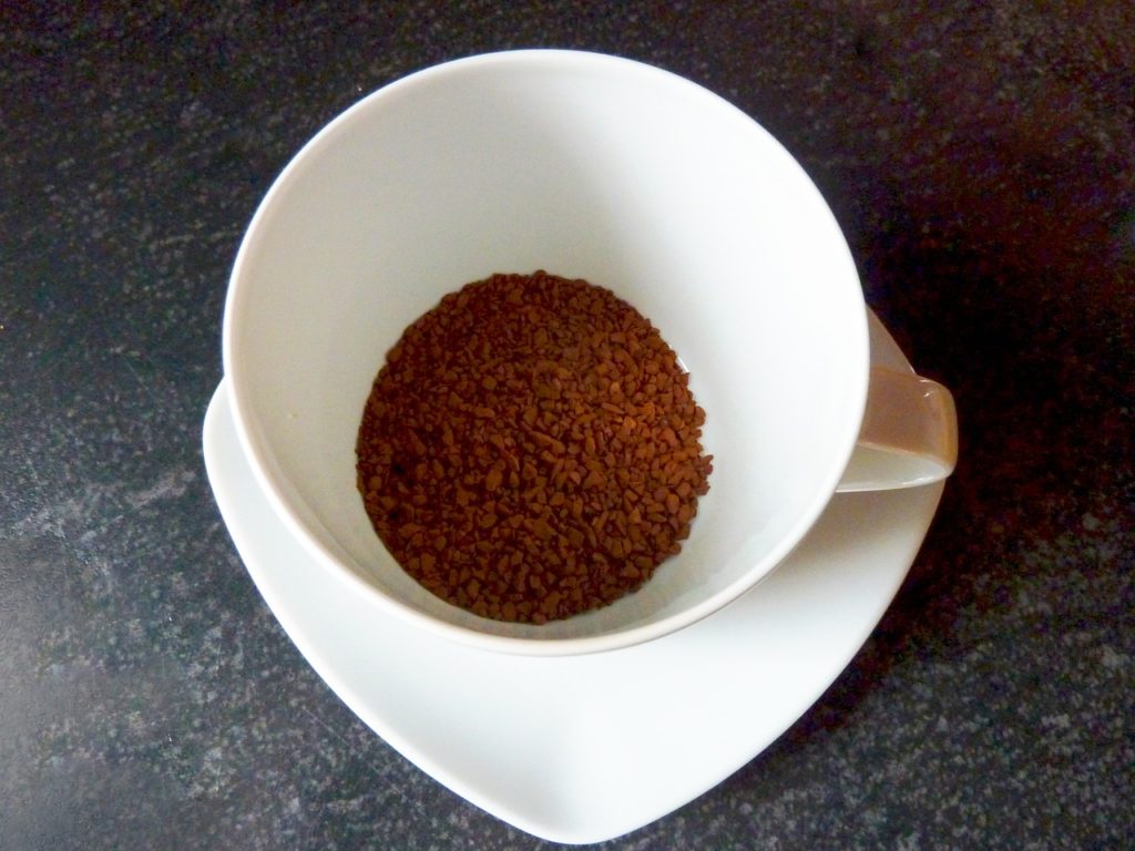 Przełóż ciasto do formy na muffiny i piecz przez 20 minut. Piecz ciasto w temperaturze 180° przez 30-40 minut lub do uzyskania złotego koloru. Następnie przygotuj napar z kawy. W misce połącz kawę rozpuszczalną, cukier i gorącą wodę. Następnie do tak przygotowanego napoju dodaj mleko.