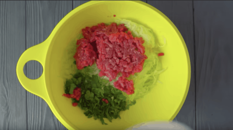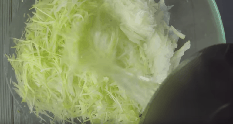 Trzeba zacząć najpierw od pokrojenia całości cebuli wraz z kapustą. Możne te warzywa zetrzeć na tarce lub posiekać ostrym nożem. Następnie trzeba je zalać wrzątkiem i pozostawić w takiej wodzie przez około 2 minuty.