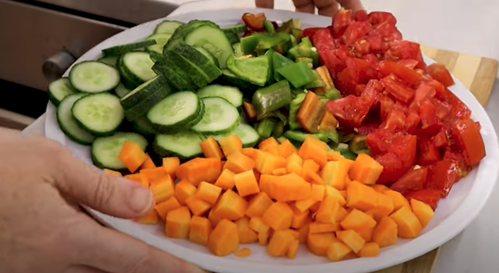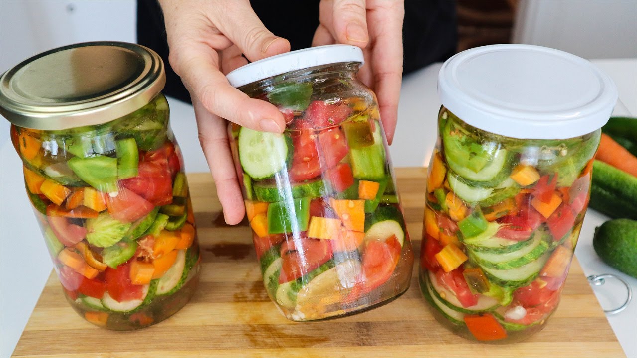 Obierz marchewki i pokrój je w kostkę. Pokrój ogórki w krążki. Papryki posiekaj w kostkę (można użyć dowolnego rodzaju papryki do smaku). Pomidory pokrój w drobną kostkę. Ząbki czosnku obierz i przygotuj do użycia. Wstępnie wysterylizuj słoiki w piekarniku w temperaturze 100°C przez 10 minut. Możesz także zdezynfekować pokrywki alkoholem lub wygotować je. Na dno każdego słoika dodaj trochę czosnku.