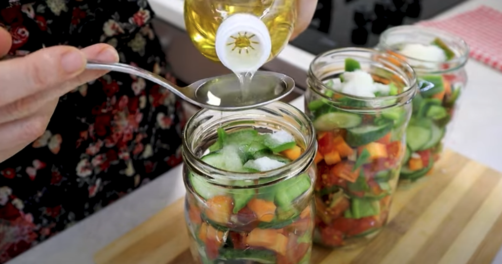 Następnie dodaj warstwy ogórków, pomidorów, marchewek i papryki. Możesz również wymieszać wszystkie warzywa i wsypać do słoików razem. Dodaj trochę pietruszki między warstwy. Do każdego słoika wsyp 1 łyżeczkę cukru. Dodaj 1 łyżkę soli (najlepiej soli morskiej gruboziarnistej). Wlej 4 łyżki oleju. Wlej 3 łyżki octu spirytusowego 9% lub octu winnego. W czajniku zagotuj wodę (możesz też zagotować wodę w garnku).