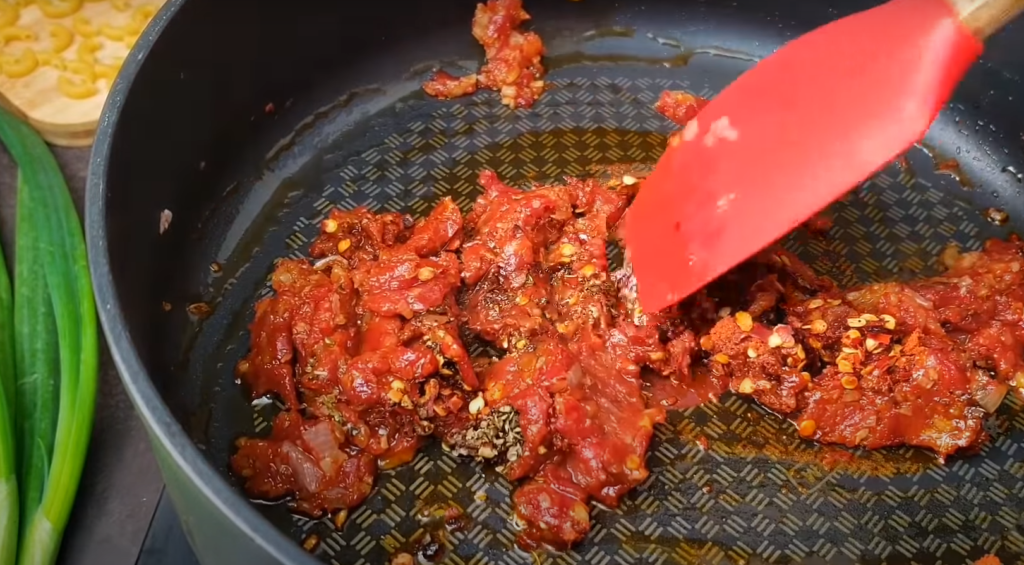 Obierz cebulę i czosnek. Drobno posiekaj cebulę i pop lub zmiażdż czosnek. Wlej trochę oliwy z oliwek na patelnię. Podsmażyć czosnek, dodać cebulę, a następnie koncentrat pomidorowy. Gotujemy 2 – 4 minuty. Dodaj sól, pieprz czerwony, pieprz czarny mielony, możemy dodać trochę cukru.