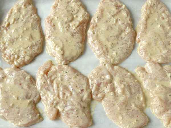 Przygotuj blachę, na której będziesz piec kotlety. Wyłóż ją papierem do pieczenia i ułóż na niej mięso w panierce. Nadmiarem marynaty, który Ci zostanie możesz zalać mięso na blasze.