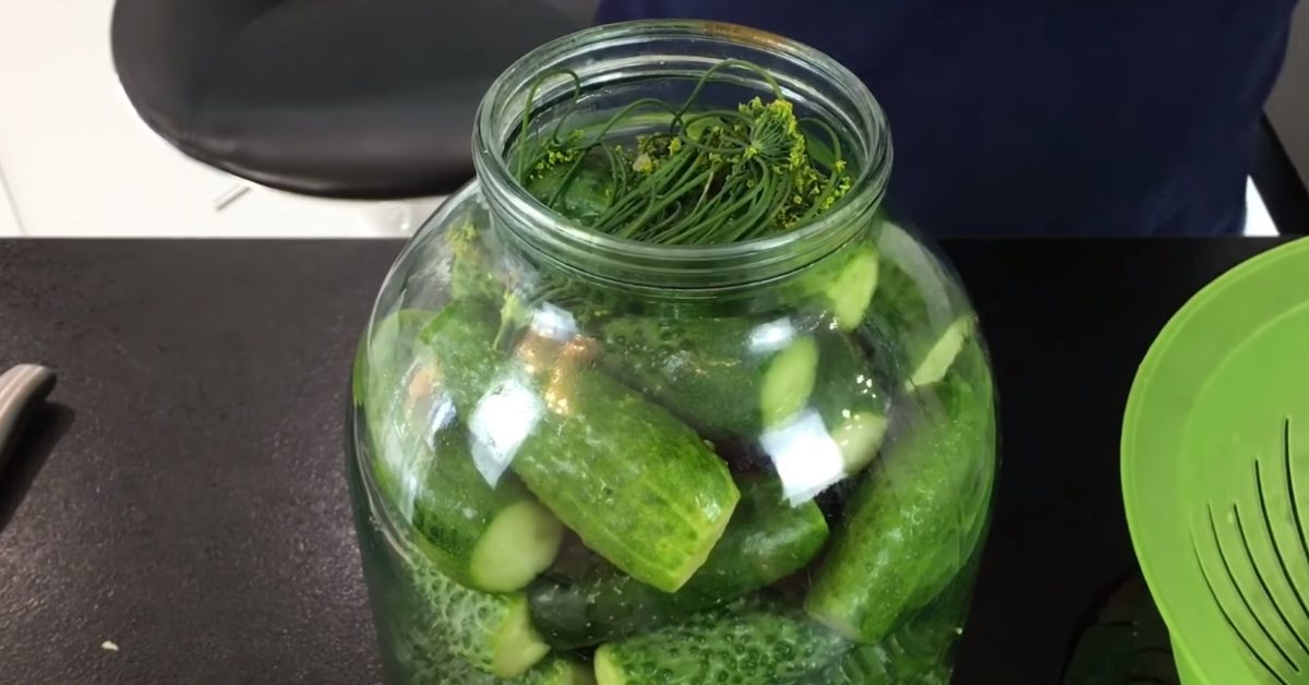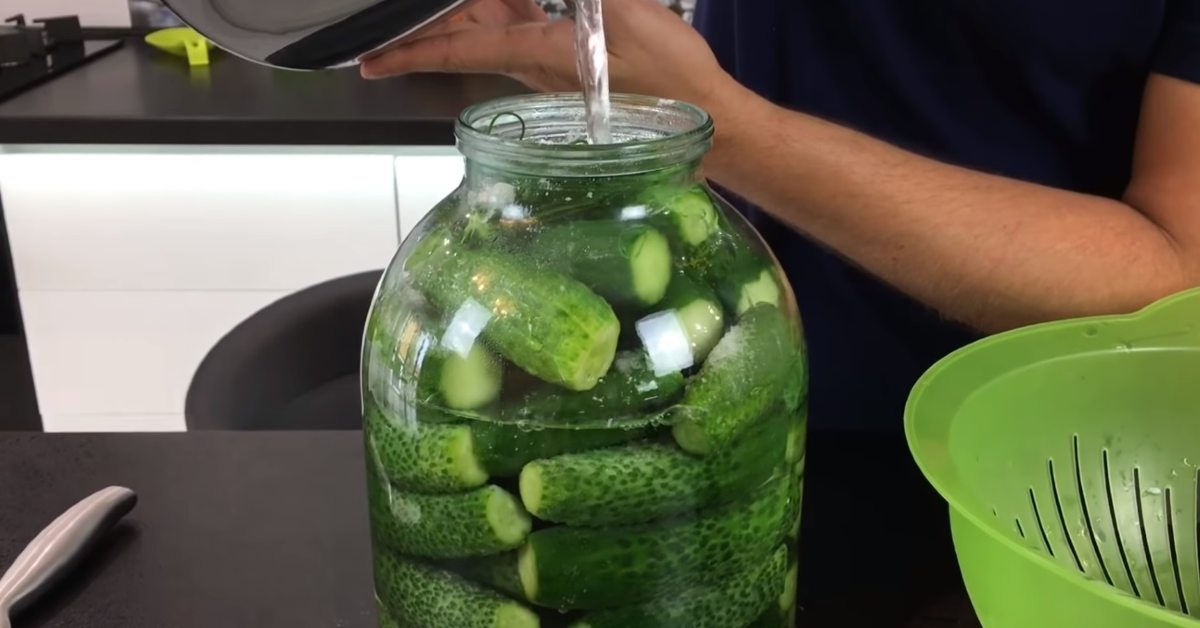 Włóż ogórki do wrzącej wody. Zamknąć słoik i delikatnie przechylić pokrywkę, aby rozprowadzić sól.