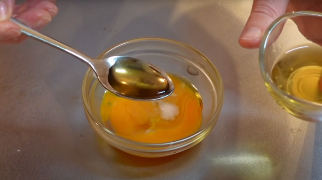 W pierwszej kolejności należy rozbić jajko i rozdzielić żółtko od białka. Żółtko należy przełożyć do osobnej miski i dodać do niego kolejno: oliwę, miód oraz olej kokosowy. Następnie składniki w misce należy dokładnie wymieszać, a na koniec należy dodać wywar z rumianku i ponownie całość wymieszać do uzyskania jednolitej masy.