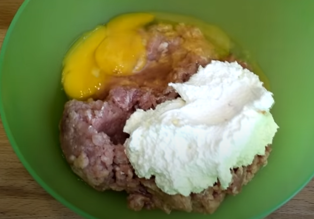 W dużej misce wymieszaj twaróg za pomocą miksera. Dodaj jajka, mięso mielone i sól do smaku. Wymieszaj wszystkie składniki, aż będą gładkie. Posiekaj lub zmiel cebulę. Dodać warzywa do masy twarogowo-mięsnej.