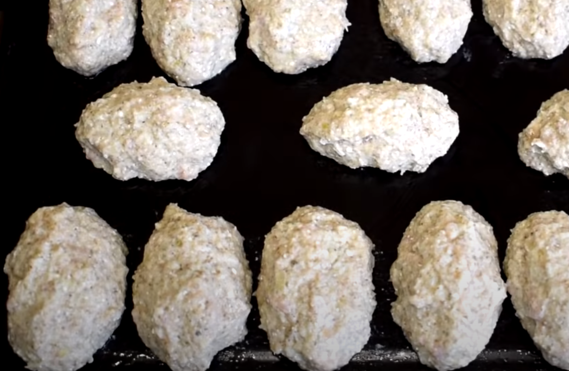 W osobnej misce wymieszaj bułkę tartą z wodą. Wymieszaj ją z mięsem. Nasmaruj olejem blachę do pieczenia. Uformuj małe placki i ułóż je obok siebie. Rozgrzej piekarnik do 180°C. Piecz przez około 30 minut.