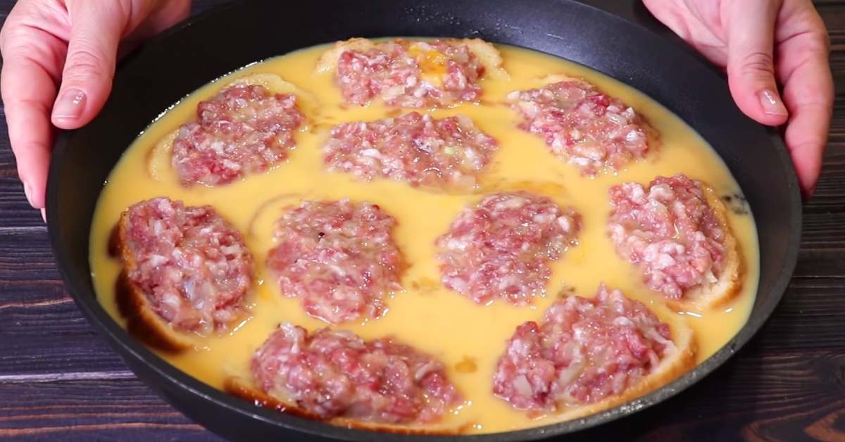 Wypełnij je mięsem mielonym. Jajka ubij osobno ze 100 ml mleka i szczyptą soli. Wylej mieszankę na chleb i mięso.