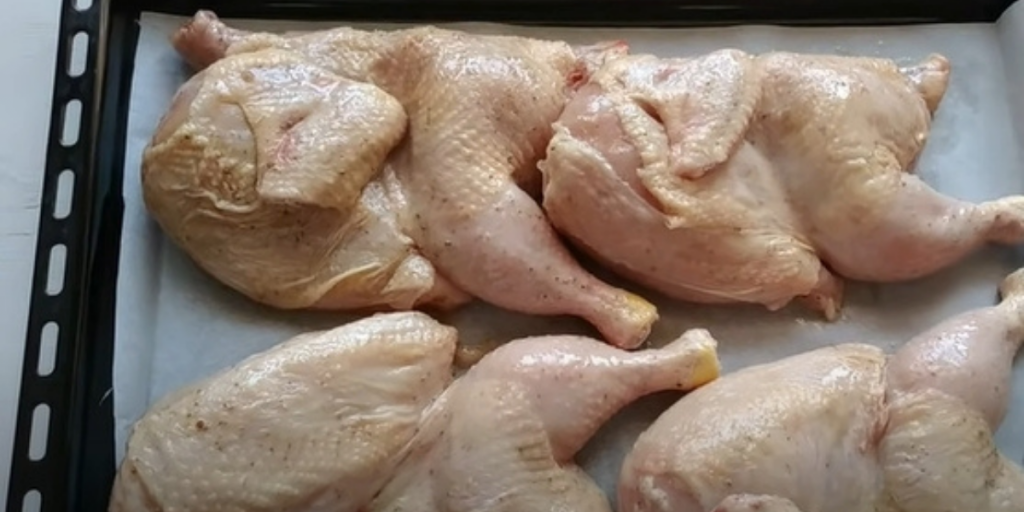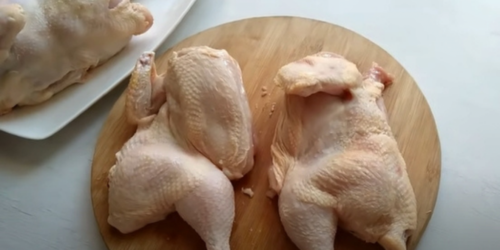 Z kurczaka należy usunąć szyję i końcówki skrzydeł. Przekroić kurczaka na pół. Następnie dodać do naczynia olej, pieprz, sól i oliwę.