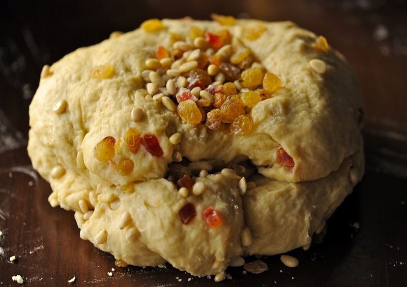 Następnie zagniataj ciasto przez 10 minut. Powinno być ono wystarczająco rozciągliwe i elastyczne, prawie jak guma do żucia. Do całości dorzuć rodzynki, kandyzowane owoce, orzechy i wymieszaj. Ciasto pozostaw w ciepłym miejscu na 1,5 godziny, aż objętość powiększy się co najmniej dwukrotnie.
