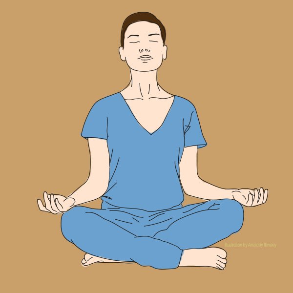 Usiądź na podłodze w siadzie skrzyżnym. Odpręż się i zrelaksuj kręgosłup. Delikatnie wyciągnij szyję ku górze, oprzyj dłonie zwrócone wnętrzami ku górze na kolanach. Pozostań w tej pozycji przez kilka minut, pogłębiając oddech i rozluźniając mięśnie.