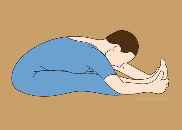 Usiądź z wyprostowanymi nogami. Pochyl się ku stopom, spróbuj chwycić dłońmi ich palce. Oddychaj głęboko – ścięgna i mięśnie nóg są bardziej elastyczne w trakcie wydechu, a to pozwoli ci odczuć maksymalne rozciąganie. Powtórz ćwiczenie pięciokrotnie.