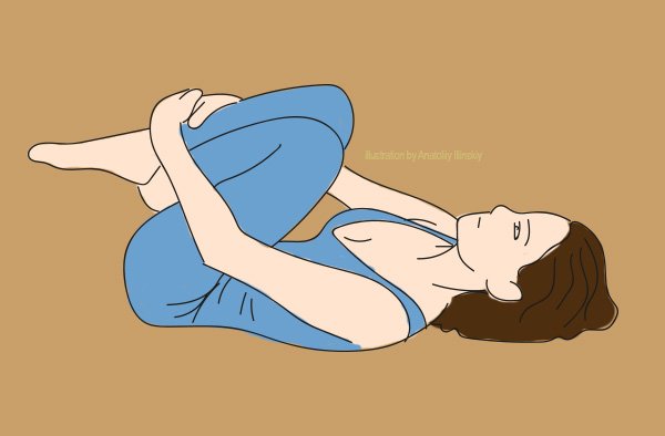 Na koniec wykonaj delikatny skręt kręgosłupa. Leżąc na plecach z rozłożonymi na boki rękami, przyciągnij prawe kolano do klatki piersiowej. Odwróć teraz ciało powoli na lewą stronę.